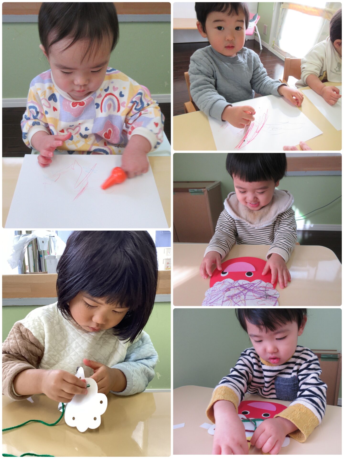 鬼のお面は子ども達が製作したものです。鬼の髪の部分に、すいかグループ(0歳児)・うみグループ(1歳児)はクレヨンで模様を描き、かぜグループ(2歳児)は毛糸で紐通しをしました。1・2歳児のお友だちは顔や角も自分で貼り、様々な表情の可愛い鬼たちができました。