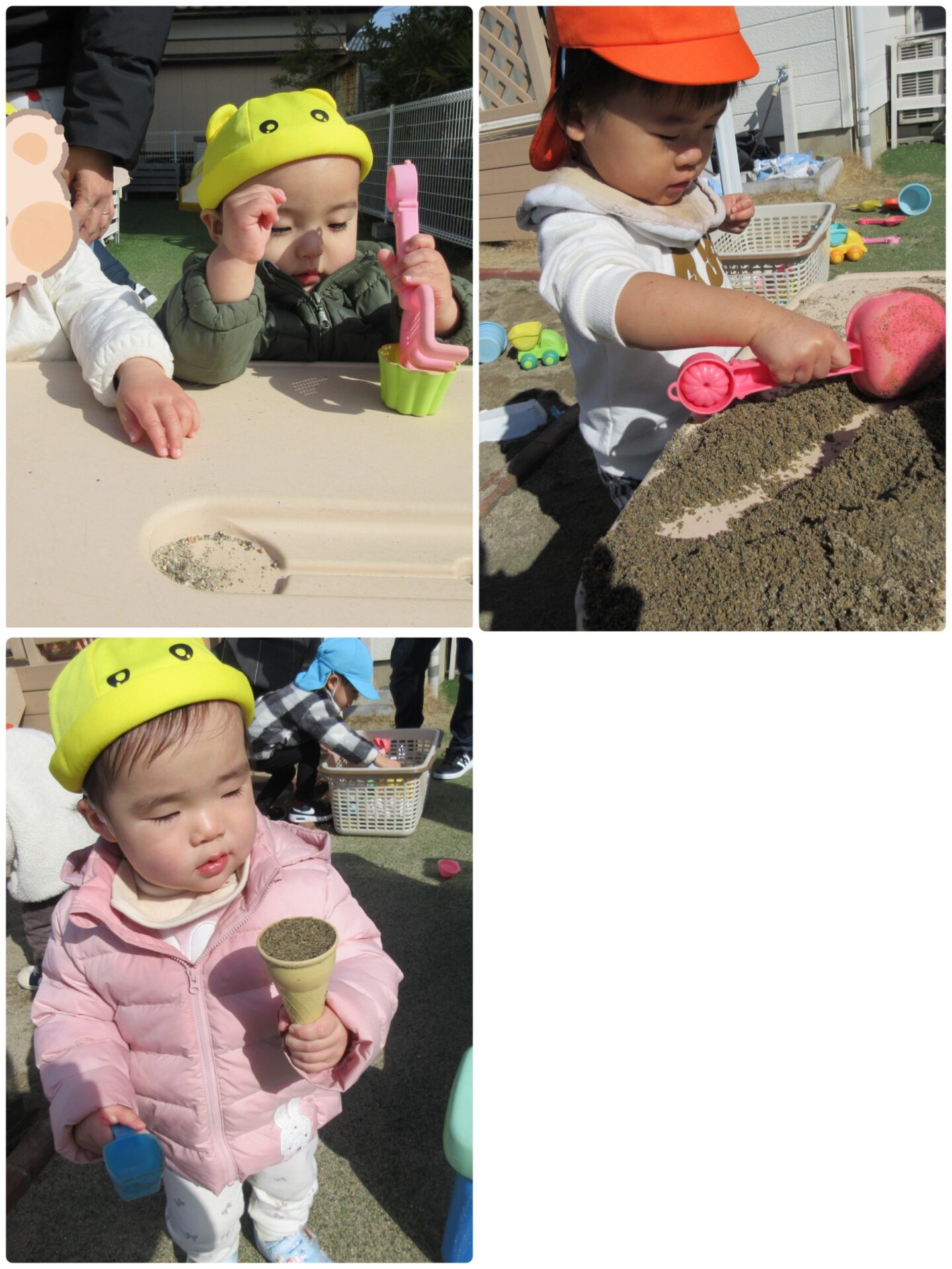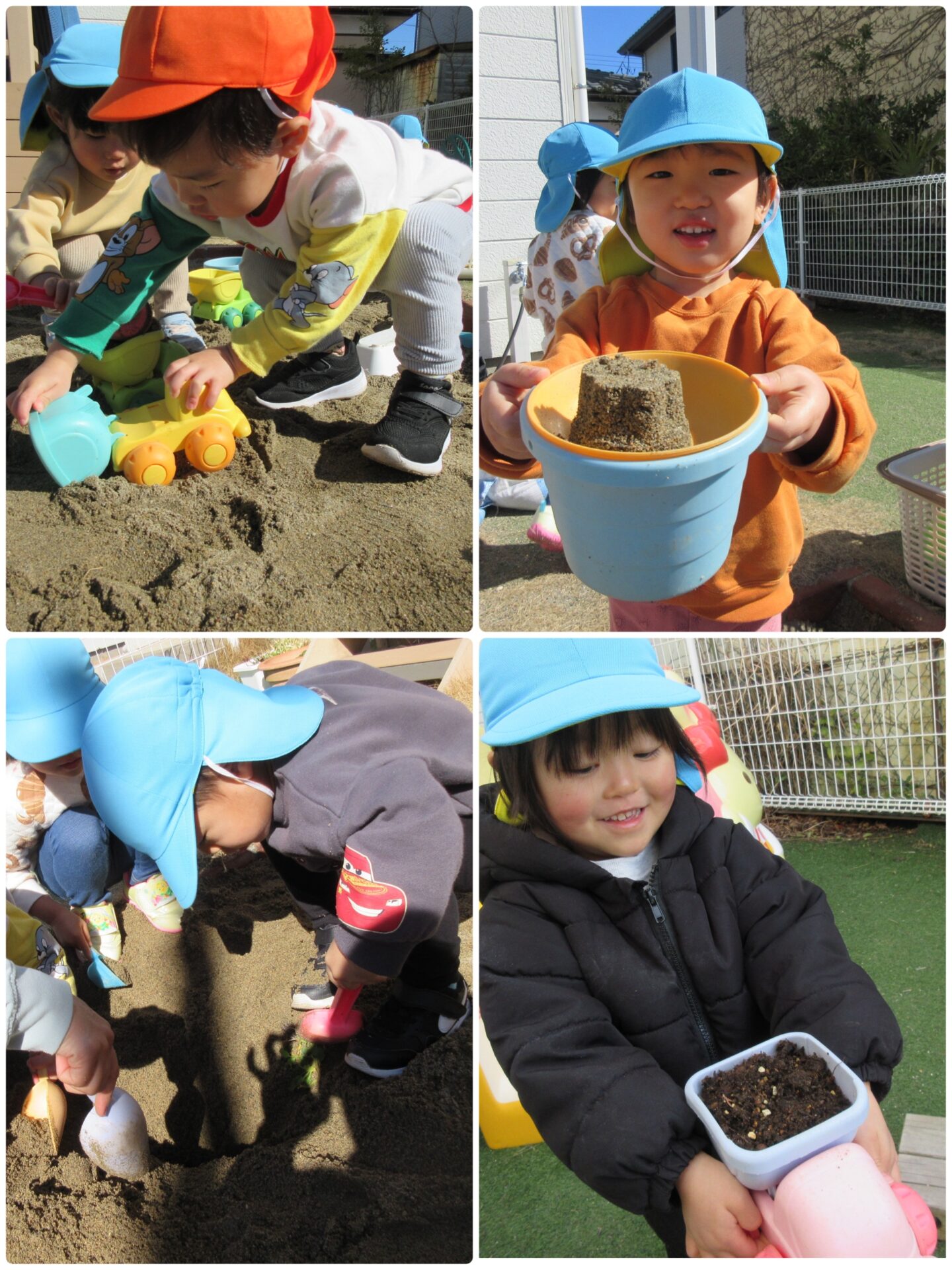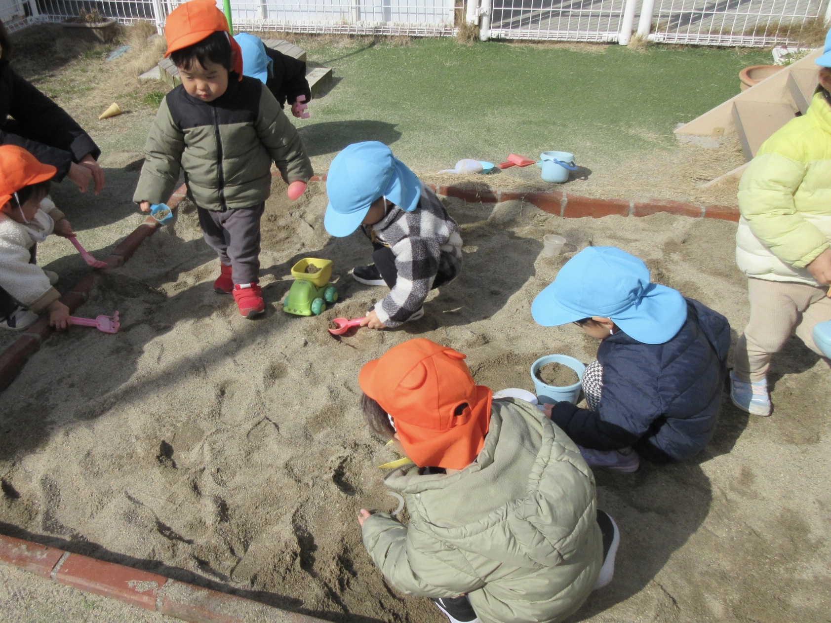 園庭の扉を開けてすぐの所に砂場があります。スコップやバケツ、ダンプカーなど様々なおもちゃから好きなのを選んで砂あそびをしています。保育者と一緒に大きなお山や穴を作ったり、カップをぎゅーっと砂に押し付けて型取りしたりなど、一人ひとりがやりたいあそび方で楽しんでいます。
