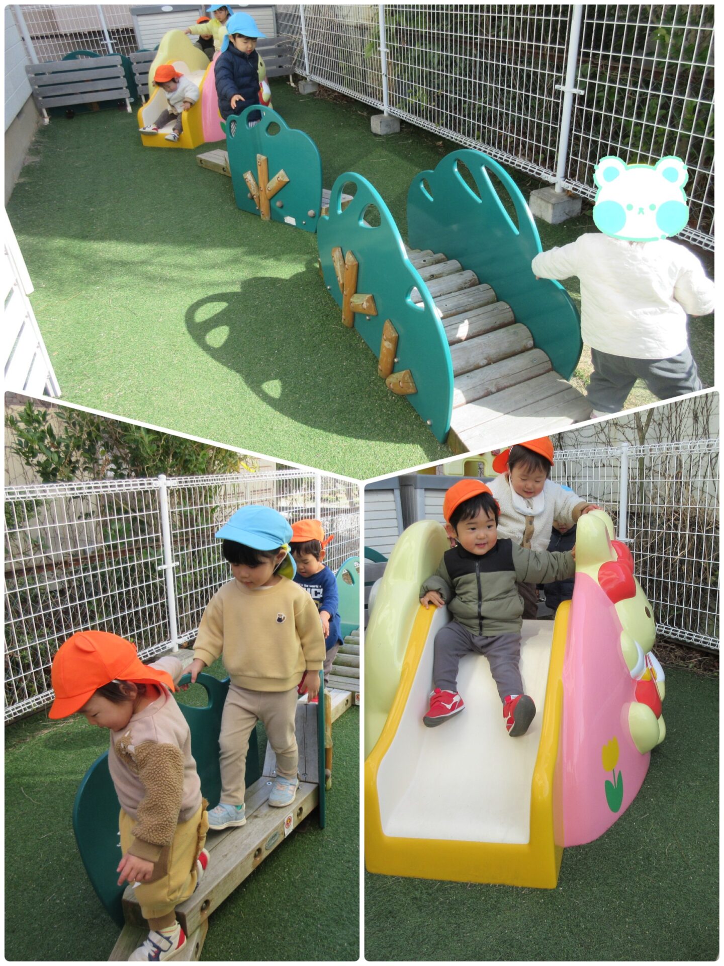 木製の遊具は、低いアーチ状の道と、曲がりくねった一本道の平均台が繋がっています。うみグループ(1歳児)のお友だちは、昨年の春頃は平均台を渡る時にバランスをとることが難しく保育者と手を繋いで渡っていましたが、今では保育者の手伝いがなくても上手に渡れるようになりました✨