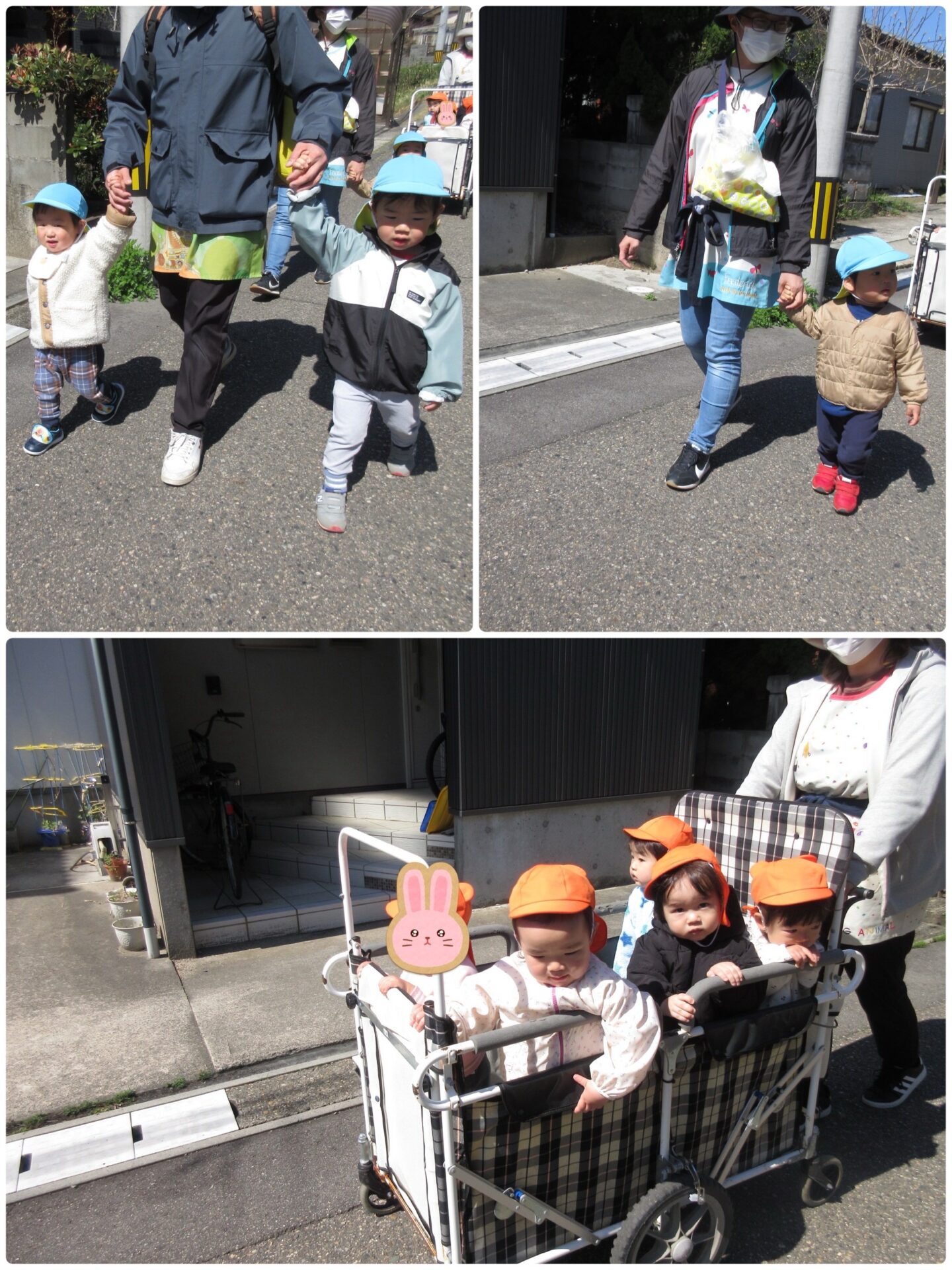 お散歩に行く時は、2歳児、1歳児、みんなで一緒に出かけます。