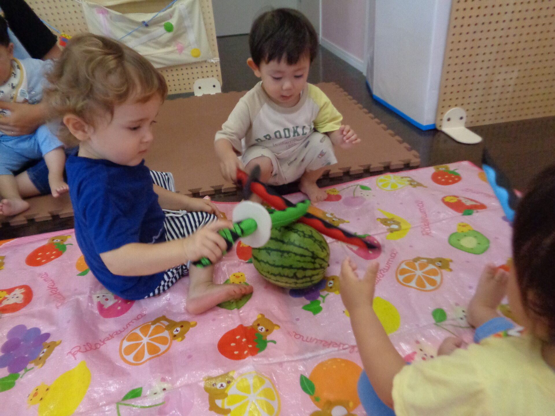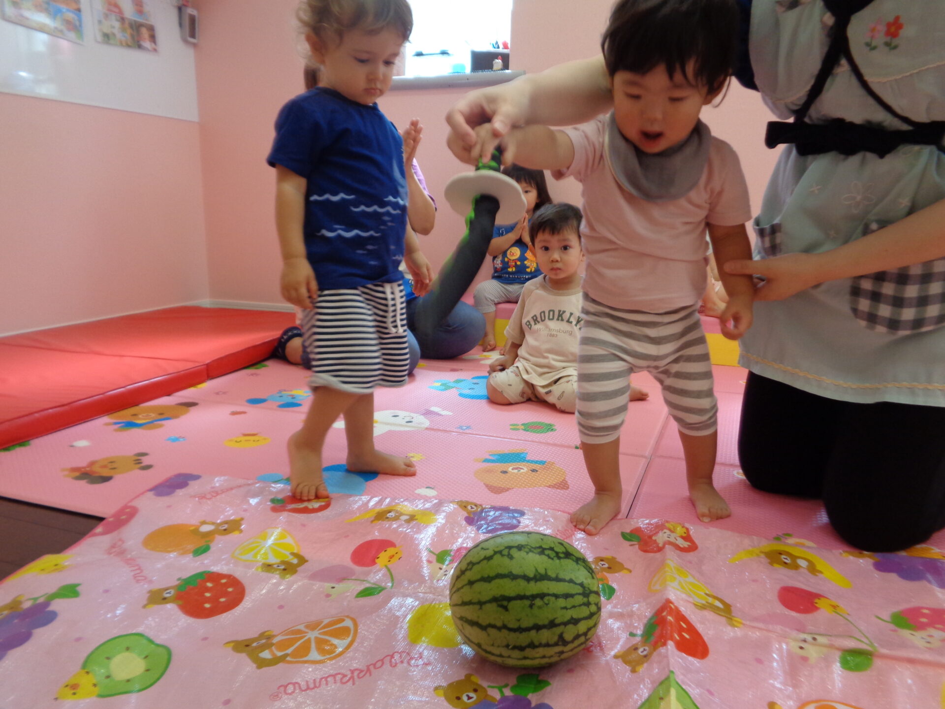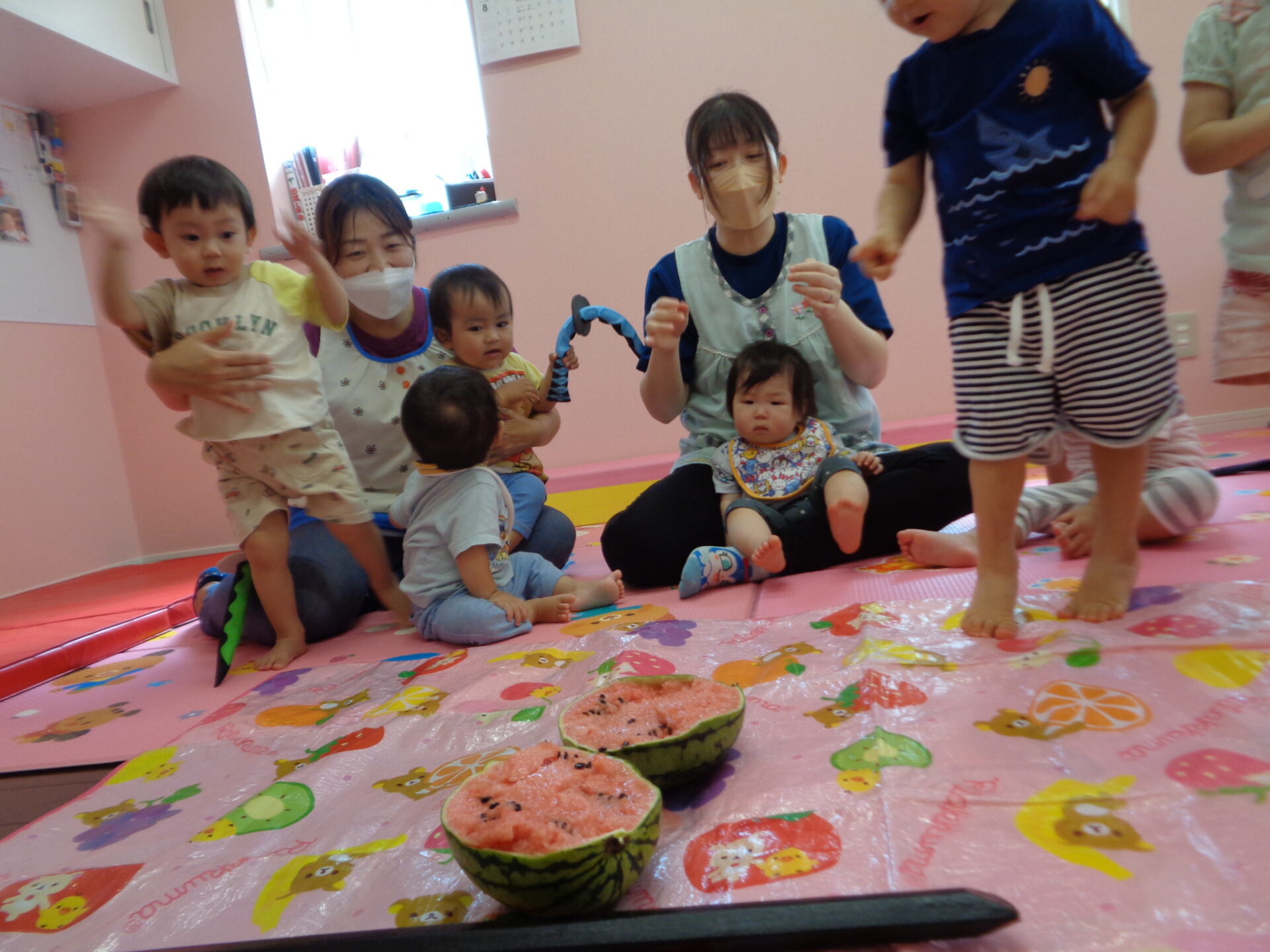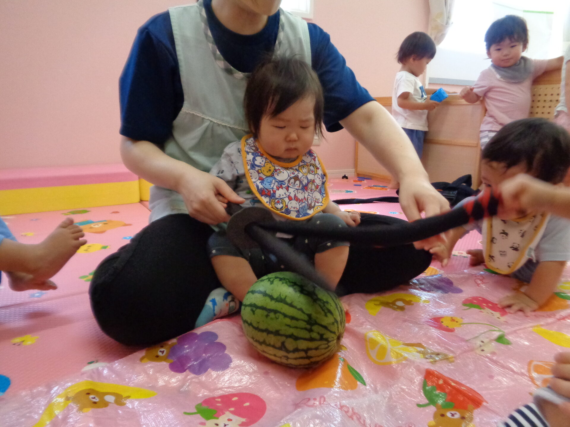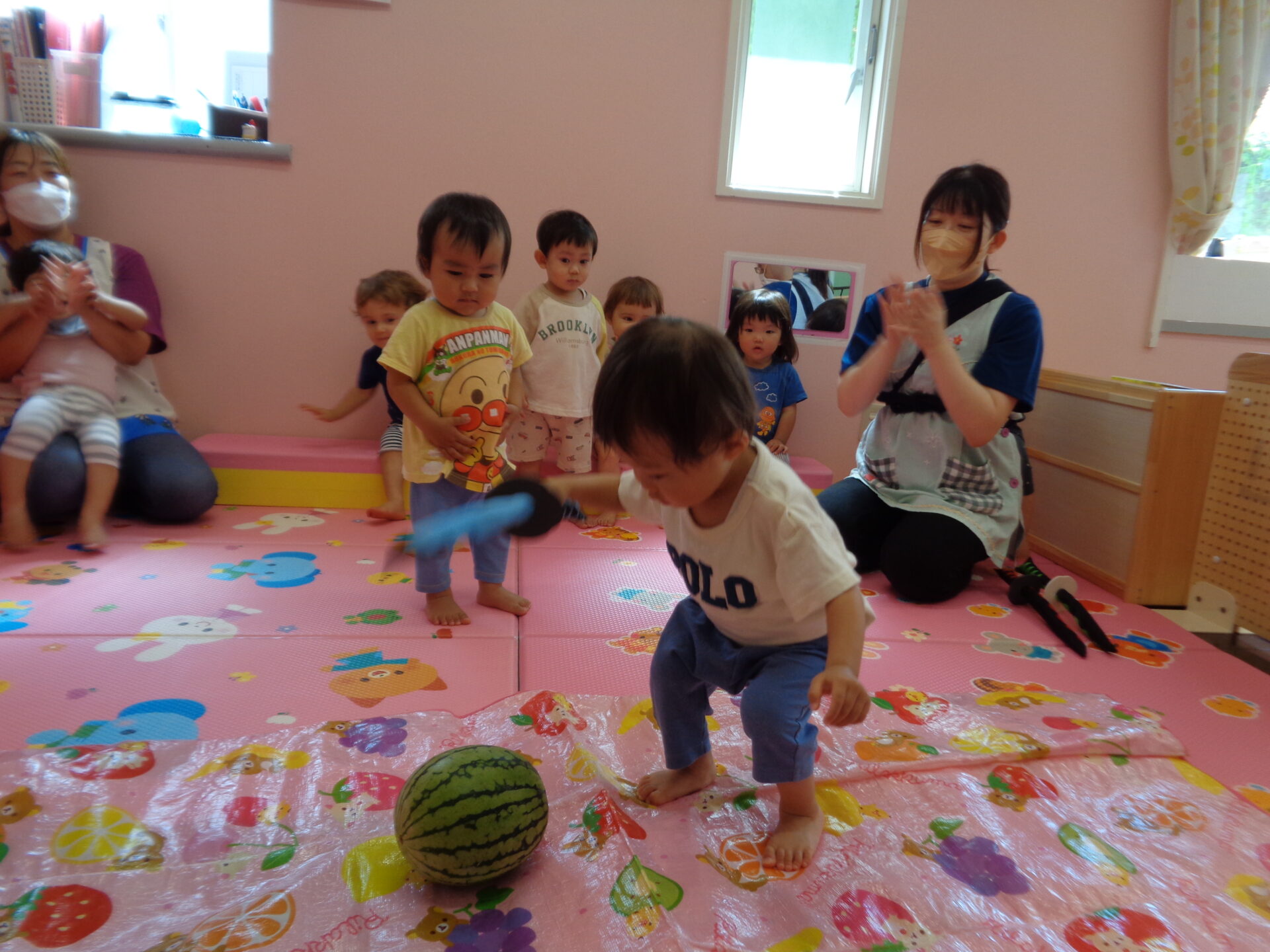 絵本のあとは、いよいよすいかが登場🍉子どもたち用には、柔らかい棒を用意しました。