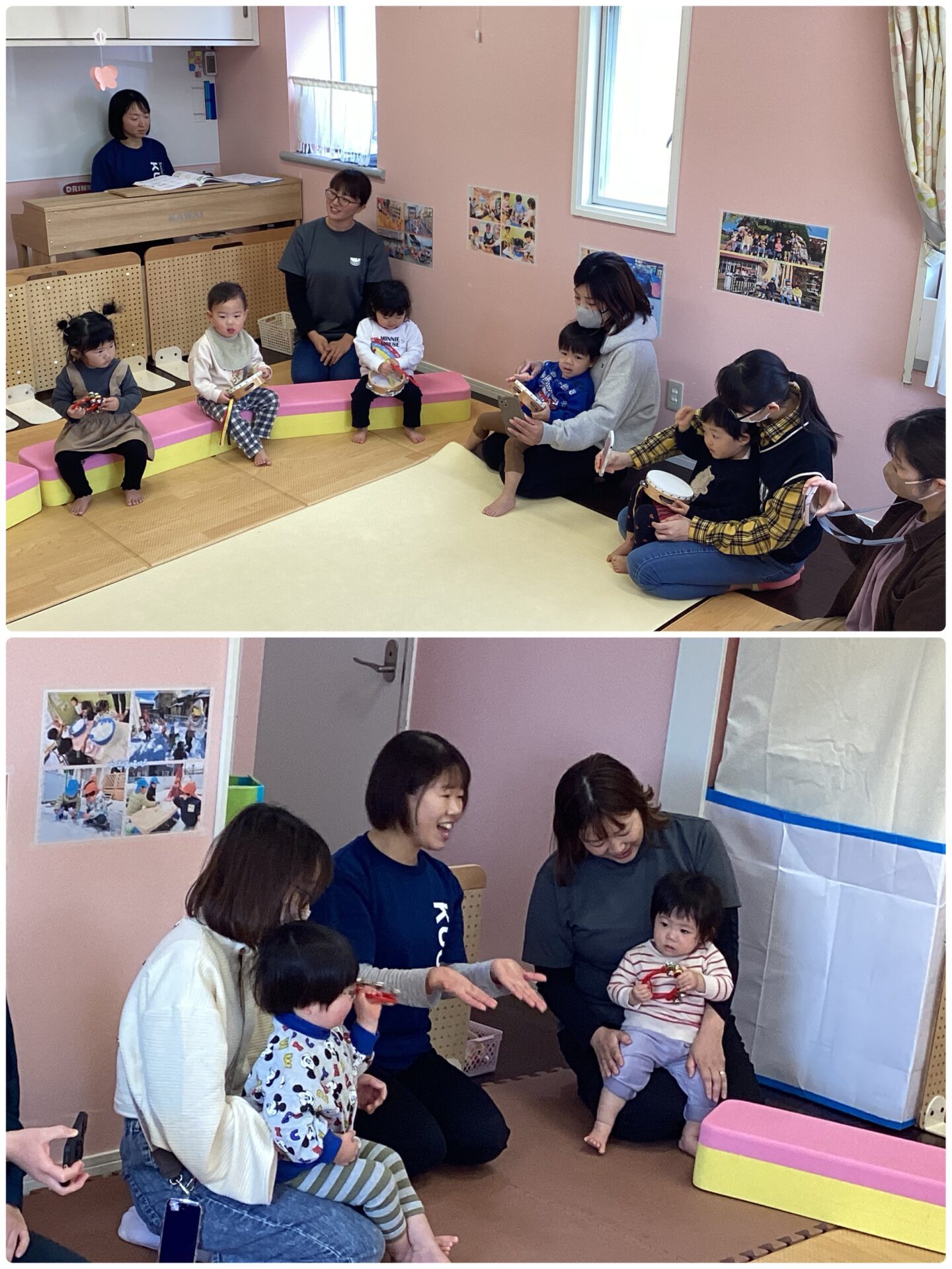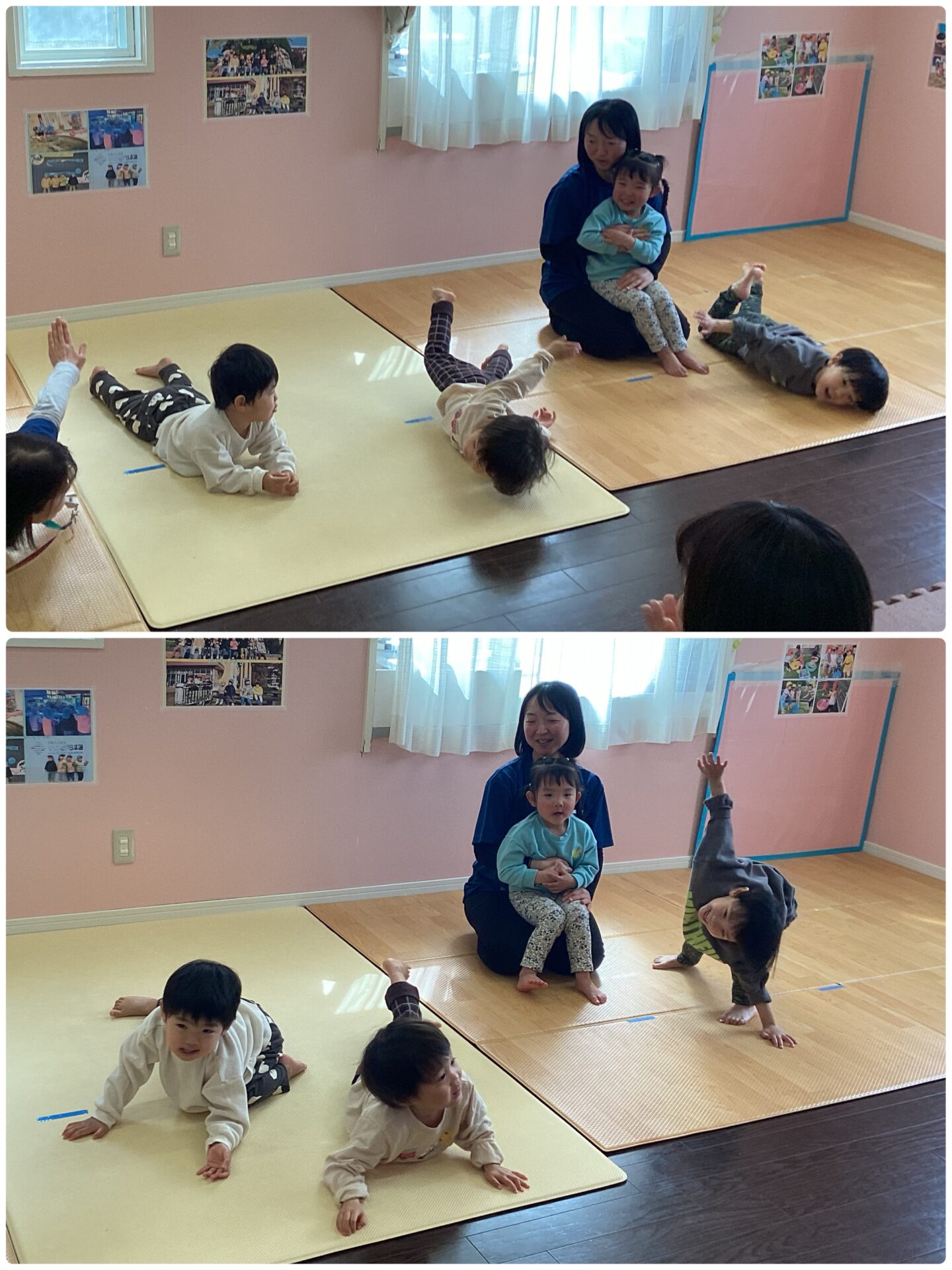 大好きなおどり「しゅりけんにんじゃ」「バナナくんたいそう」は、いつもは音楽がかかるとノリノリで踊る曲ですが、今日はちょっぴり緊張気味な子どもたちでした☺️