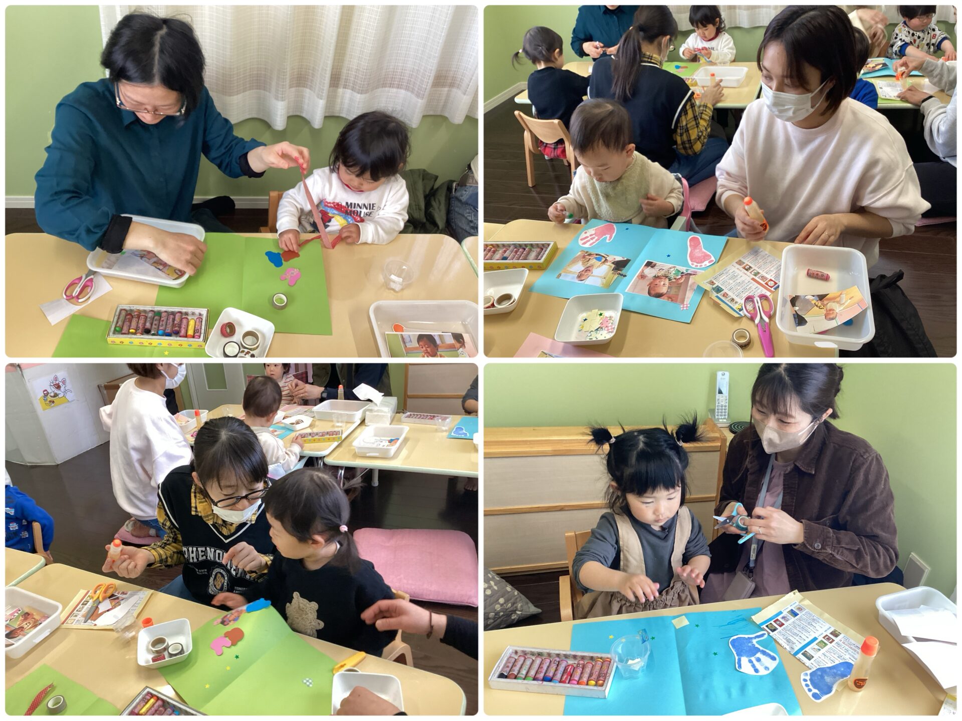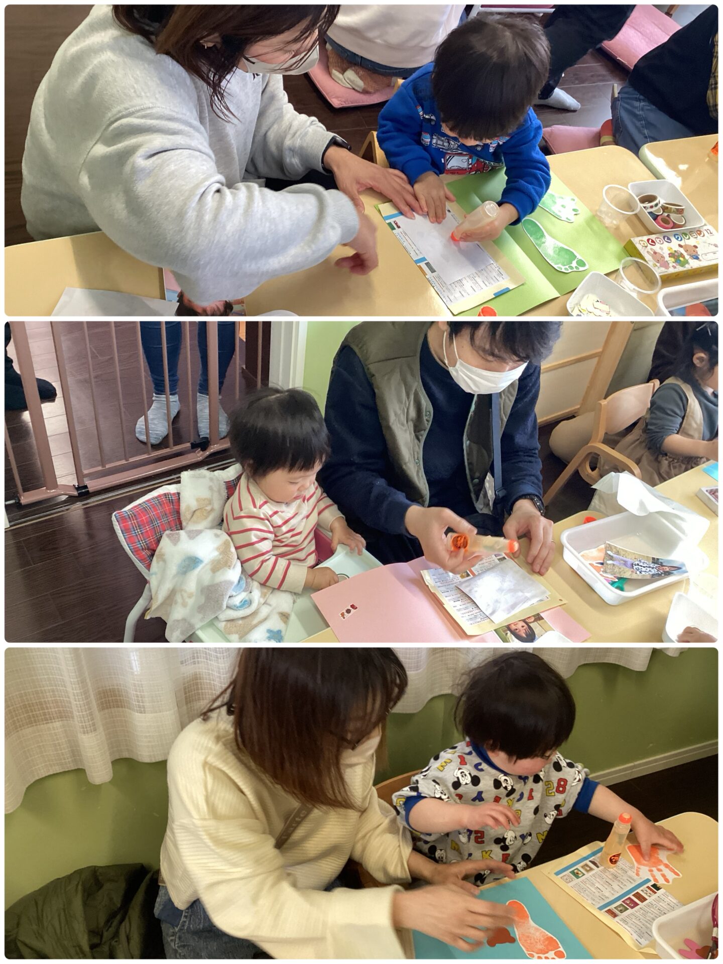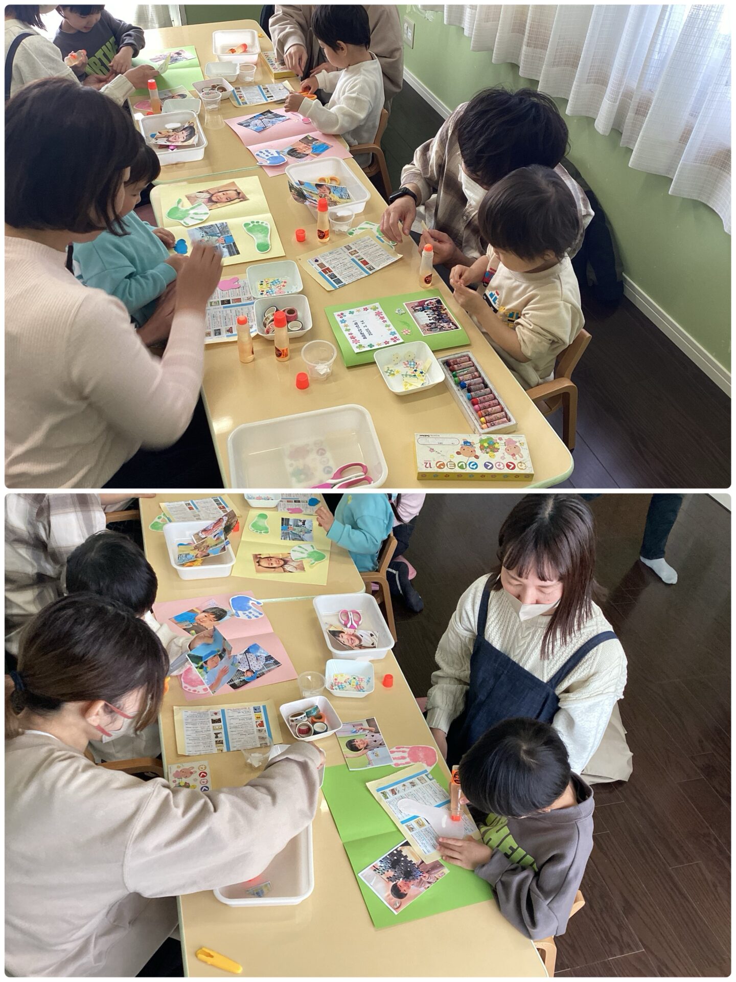 保育園で撮った普段の写真や、一人ひとりの手形足形などを貼って、「大きくなったね!ペーパー」を作りました。シールやマスキングテープを貼ったり、おえかきをしたりして、素敵にデコレーション✨